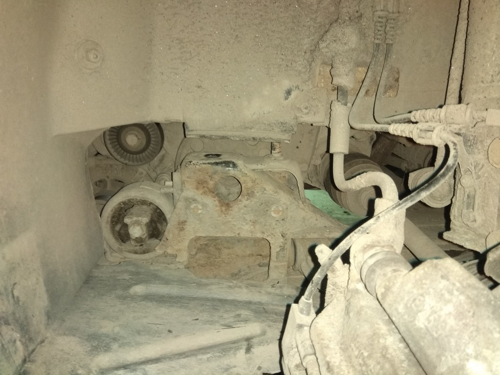 Приспустил подрамник, передние болты вкручены на 2-3 витка, подрамник в районе катализатора опустился на 10 - 15 см. Шкив помпы только показался. Впускной коллектор, трубка моторного щупа уперлась в моторный щит. Где-то читал что вкручивают длинные болты и потом приспускают, завтра выкручю полностью и отпущу тельфером.