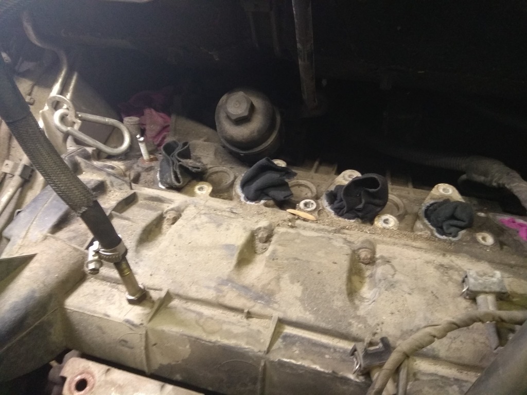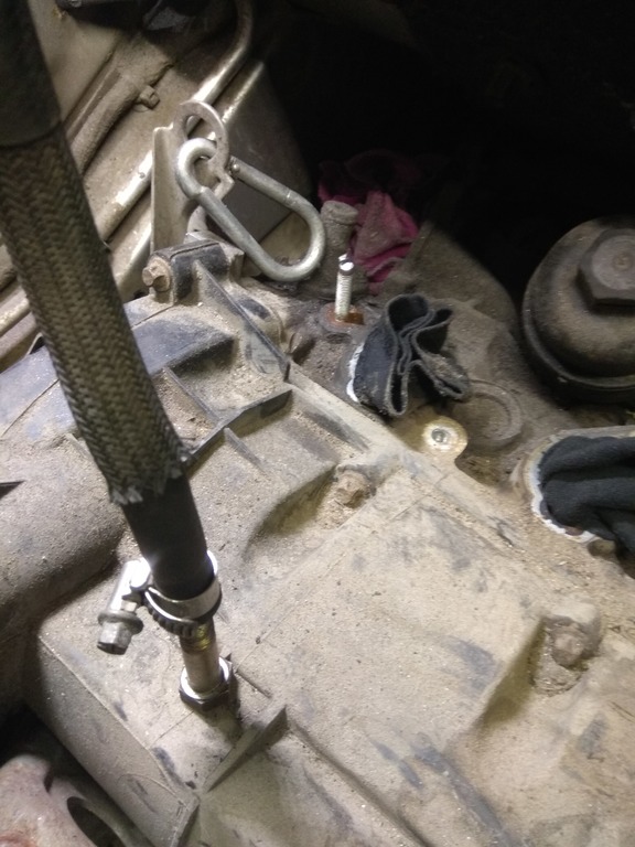 Приспустил подрамник, передние болты вкручены на 2-3 витка, подрамник в районе катализатора опустился на 10 - 15 см. Шкив помпы только показался. Впускной коллектор, трубка моторного щупа уперлась в моторный щит. Где-то читал что вкручивают длинные болты и потом приспускают, завтра выкручю полностью и отпущу тельфером.