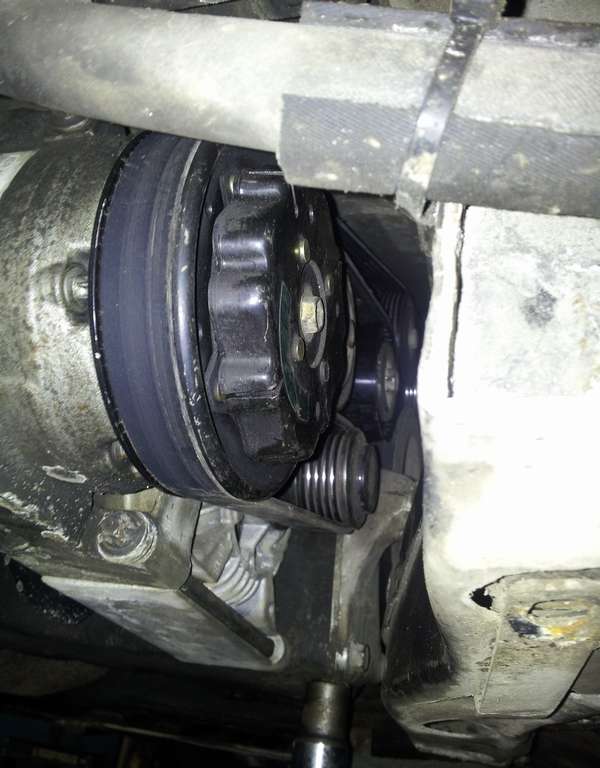 Что-то помню тоже, но там муфта другого типа была вроде как. Здесь болт вкручивается в вал компрессора. Шкив застопорить нужно. Хотя если не снимать ремень у меня болт просто ключом откручивается.