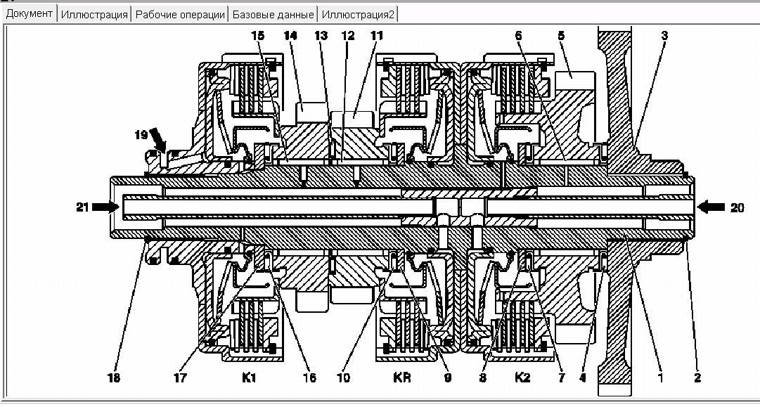 Через отверстия в первичном валу подается давление масла к сцеплению блокировки гидротрансформатора, а также сцеплениям К3 и К;. Давление масла для сцеплений К2 и КR (задней передачи) подается через промежуточный вал. Сцепление К5 обеспечивается маслом через отверстие во вторичном валу. Через остальные отверстия в валах подается и распределяется смазочное масло. Все посадочные места, а также сцепления К1, К2, К3, К4 и К5 обеспечиваются смазочным маслом.