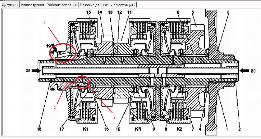 3) Позиция №3(выделена красным цветом) на чертеже показывает, что на валу есть отверстие которое расположено напротив отверстия находящегося в муфте К1 и в моем понимании означает, что муфту необходимо устанавливать таким образом чтобы отверстия были напротив друг друга (как на чертеже). Но!!! между отверстиями имеется зазор который имеется по всему диаметру сопряжению двух деталей ,а соответственно как бы мы не поставили муфту К1 масло все равно будет попадать в отверстие муфты К1 (подача масла в данное отверстие осуществляется при включении 2 й передачи). Единственное не понятно зачем смазывать тарельчатые пружины?