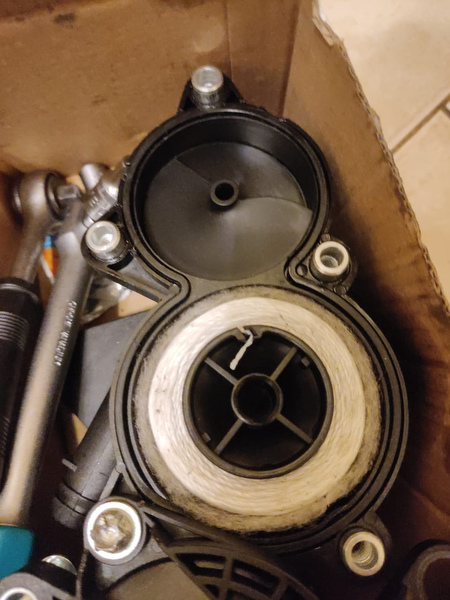 вскрытие показало, что новый маслоотделитель внутри соврешенно сухой, ни следа масла, фильтр намотка+слой синтепона, втянуть через него воздух ртом (в отличие от старого) невозможно, не тянется.