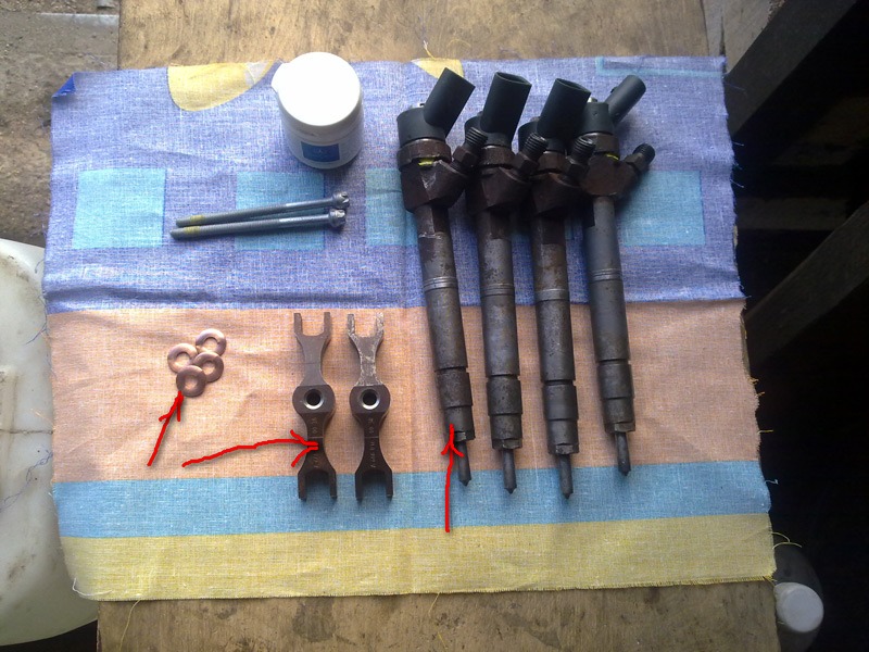 итог таков: сгорел в форсунке стакан или это втулка,не знаю как правильно называется(вроде как пластмассовая),сломано уже было сказали до этого момента крепление,(дожиматель,держатель) форсунок и из 4-ёх шайбочек одна из них была не того диаметра и не медная.....
