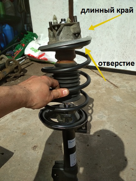 Посмотрите, правильно собрал? Стрелочками указаны отверстие в чашке и длинный бортик опорного подшипника