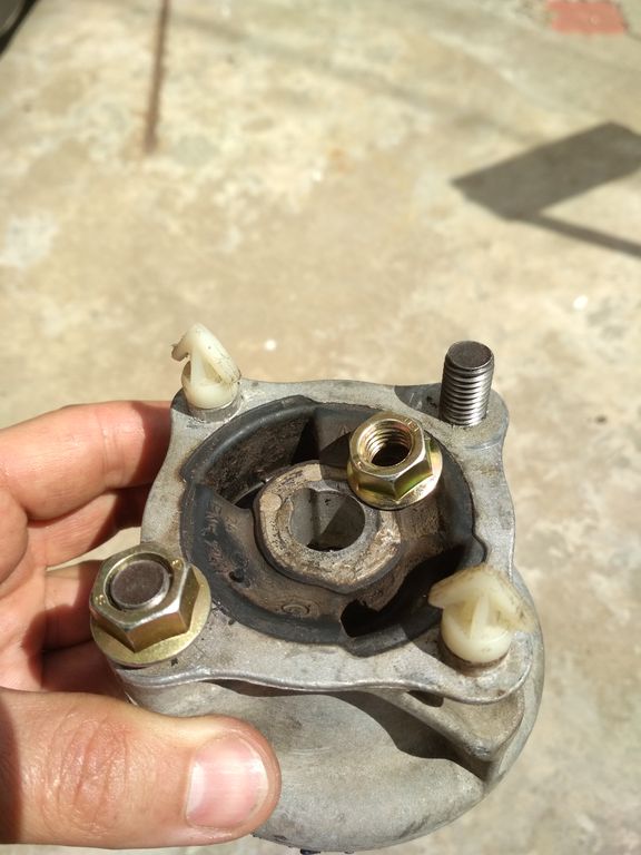 Болты в опорном закисли намертво, при аккуратном откручивании, с молитвами, как полагается, всё равно оборвались оба. Час их аккуратно высверливал-игрался с ними, и всё равно каждый виток резьбы просто зубами держался за опору. Потом зашёл отец в гараж, посмотрел через моё плечо на этот секас, отодвинул меня в сторону, высверлил их 8-кой, нарезал резьбу на 10 и вкрутил шпильки. Во как...